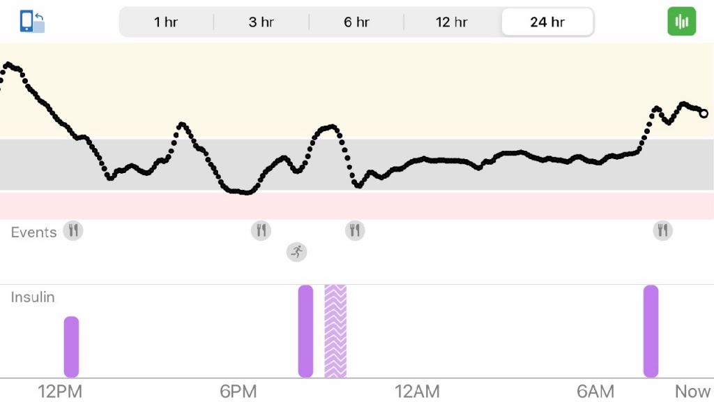 坚持总会有回报。那台价值300美元的传感器终于到了。我擦干净上臂,有点害怕,“这会很痛吗?” 咬咬牙我把注入器紧紧贴在我的手臂背后,一按按钮,只听见“啪”地一声,手臂感觉一个撞击,没有其他感觉。摸一下,一个圆形扣子状的传感器已经按上了我的胳膊,我成了半机械人。半小时warm up之后App里开始弹出数字点阵,一如心跳。